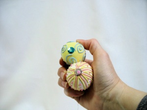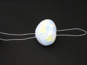 To hang eggs from a thread, use a long needle to pull the thread or fishing wire all the way through each egg. It’s smart to hold the needle up to the egg first, to make sure is longer than the egg. You may need to use pliers to finish pulling the needle through the other side. Fasten the bottom end with a bead and sequin to keep the thread from coming out through the egg.