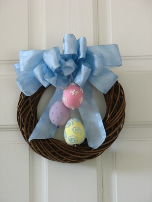 The bow can go at the top of the wreath, or at the bottom. The eggs shown here are fastened on with florist’s wire. The wreath almost looks like the handle of a basket full of eggs, doesn’t it?