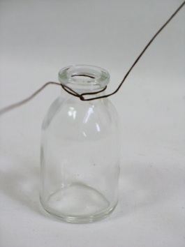 Twist florist’s wire around the neck of tiny jars. Tie a colorful ribbon around the neck of each jar, if you wish. (I purchased beads in these jars, and saved them to make this wreath. I also used some jars as tiny vases to put fresh flowers at each plate when guests came to eat.)