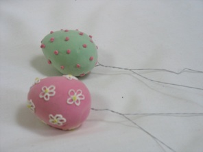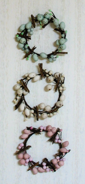 When fastening eggs onto a wreath on their sides (as in the photos below), make both ends of the wire go into the side of the egg and come out the other side, rather than top to bottom. You want the wire to show as little as possible, so make the two ends go in close together.