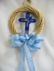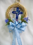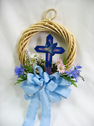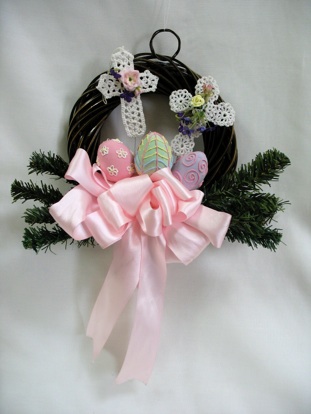 Usually this kind of greenery is only used with Christmas wreaths, but I thought it looked a bit like the fake grass in Easter baskets. You can add small crosses to keep the true meaning of Eater in the decorations. These crocheted crosses were fastened on with florist’s wire.