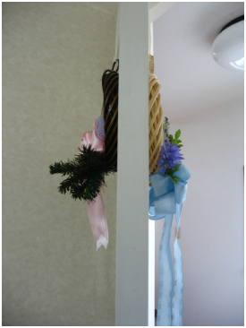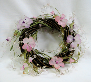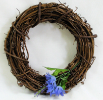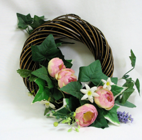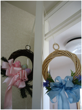 Just a few flowers can be as pretty as a whole wreath full. (Flowers and wreath were purchased at 100 yen stores.)