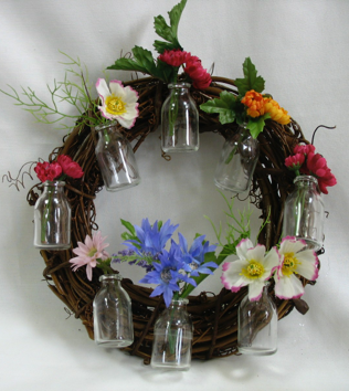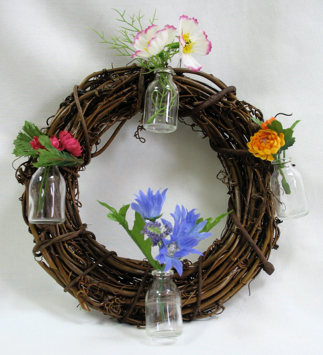 Fasten bottles on a wreath with the florist’s wire. Fill each jar with flowers. As much as I love the idea of using fresh flowers on this wreath, vases always get scummy when flowers are left in them, and if you don’t wash them out, the next flowers die even faster. So if you don’t want to have to take the bottles off the wreath and wash them every time you put flowers in them, you may want to use silk flowers. (Notice the ends of the wire made to look like tendrils in the right hand photo--just to the left of the red flowers on the left.