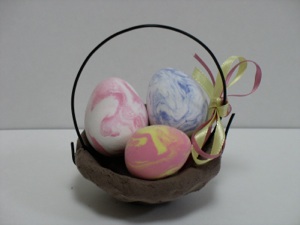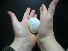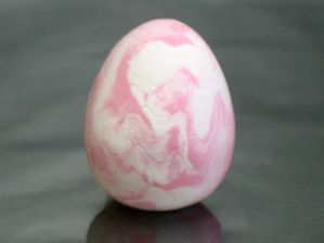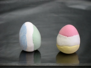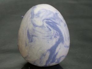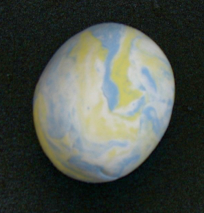 This is a good way to use up left over clay from other craft projects. Gently squeeze together several pieces of left over clay (but don’t squish them together as in the marbled eggs above). Roll them into a ball, then into an egg shape (explained above.) The sections will stick together better if you dampen the slightly before squeezing them together. But don’t add too much water, or it makes it goopy. If that happens, just wait a minute--the surface dries pretty quickly.