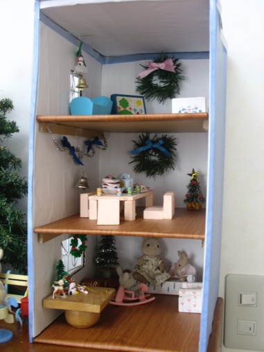 The ground floor of this house is a pizza parlor that has Christmas bells taped to the ceiling. The second floor is the living quarters with a chenille wire wreath on the left wall, and a dollar store Christmas tree branch wreath on the back wall. The flat roof provides a porch, though it’s hard to see through the “wrought iron” fence (plastic lace in the gift wrap section of hundred yen stores.) You can see the porch a bit better in the photo above. The blue chairs are from a hundred yen store stacking game.
