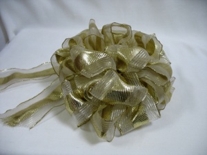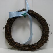 The last loop should be one small one in the middle. Fasten the whole bow with florist’s wire--through that small middle loop and around all the other loops in the middle. Twist several times in the back to secure the bow. If the wire is long enough, you can use the ends to fasten the bow to the wreath. If not, use another wire to fasten it on to the wreath.