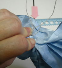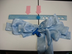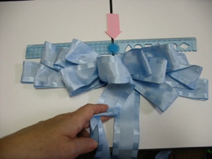 For large bows (5 meters) alternate the pairs of loops that are the same length with single loops, so that when you pull the pairs up and down, there is the single loop remaining in the middle. The pink arrows show where the single loops should go.