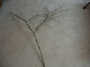 Start with the longest branch. Carefully hold the two ends of the branch between the thorns, and bend it into a circle.