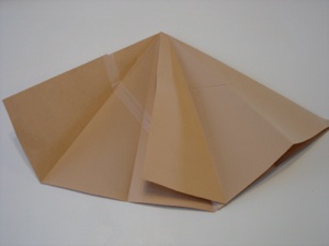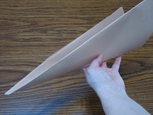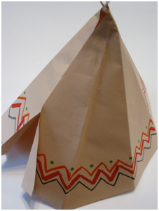 10. Tape the seam at the top of the teepee on the inside. Do not tape the bottom because it will form the door. Fold flaps to form the door. It should stand on it’s own. If it is tipsy, trim the bottom edge.