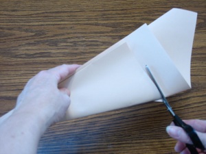 5. Cut along the shortest edge and you will have your teepee cut out. Although the photo shows cutting along the edge of the paper, the bottom edge of the teepee will be straighter if you cut at a slight angle as shown by the dotted red line.