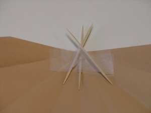 8. Tape 3 toothpicks to the top edge so they look like poles coming out of the top of the teepee.