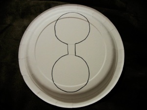 I cut the head, and wings out of another paper plate so the colors would match, but colored paper in a similar color, or contrasting color works, too. The bottom of the cup is white, so I cut one circle to cover that, and the other circle to be the head. I used the bottom of the cup as a pattern. Fold where the orange dotted line indicates.