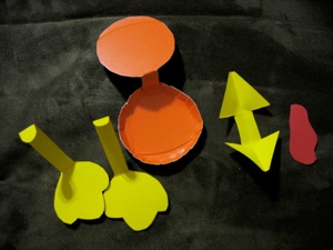 Cut feet out of yellow paper and glue on the cup. Cut the beak and fold it in half lengthwise so the sides of the beak are not flat. Unfold and glue the middle part of the beak (between the two triangles ) to the face. Fold the top and bottom beak together and adjust once it is glued to the face. Cut out a red waddle and glue next to the beak.
