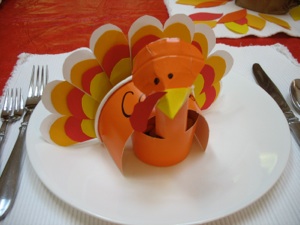 Once the turkey is assembled, turn the cup right side up, fill with candy or nuts, put a small plate on top, and turn upside down. Write a name on the tail or stomach.