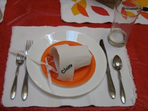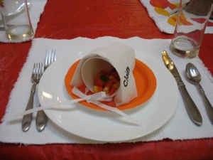 Once the turkey is assembled, fill the remaining half of the cup with candy or nuts and place the cut portion of the cup back over this sideways to form the body and wings. Write a name on this back or on the turkey’s front. (the back is easier for guests standing near the table to see, but the front of the turkey would have been a better choice for the photo...oh, well.)