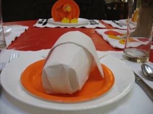 Put a paper cup on its side, and lay a paper towel over it. Fold the front twice to form the front “flap”of the bonnet. Cut the paper towel to fit so both sides of the “flap” just rest on the plate.