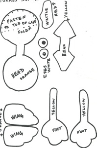 To make the turkey, cut off the top half of an orange paper cup, being sure to leave about an inch wide neck. Use the cut off part to form the body and wings.