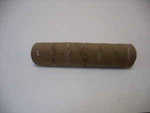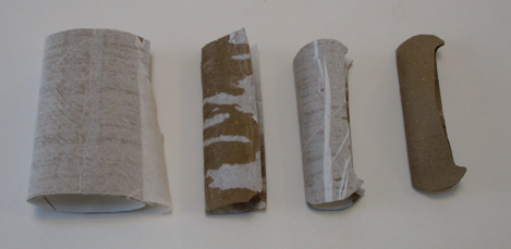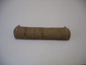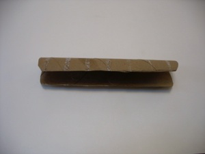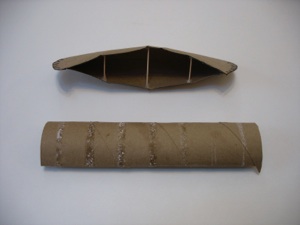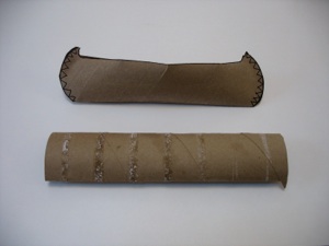 You can make smaller canoes out of toilet paper tubes. If the paper sticks to the tube, don’t worry--it will look like birch bark canoes! You can make 2 canoes out of each tube. Make them the same way as the instructions describe above, but the tube should be cut in half as shown by the dotted line in the photo above. If you prefer to use paper towel tubes instead of toilet paper tubes, cut the paper towel tube in half both directions as shown below.