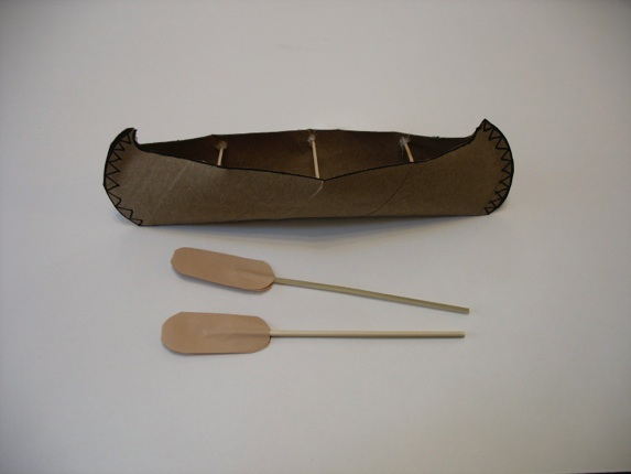 Cut or break toothpicks to size and glue them on the inside of the canoe to keep it open. A glue gun works well for this, but you still have to hold the toothpicks in place until the glue hardens.