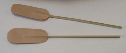 To make paddles for the canoe, cut bamboo skewers to a good length to match the canoe. Cut 4 sheets of brown paper (such as brown paper bags) and glue 2 on each stick, one on each side of the stick.