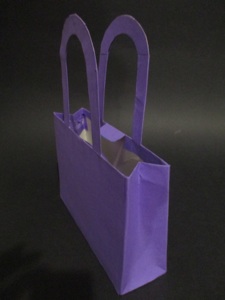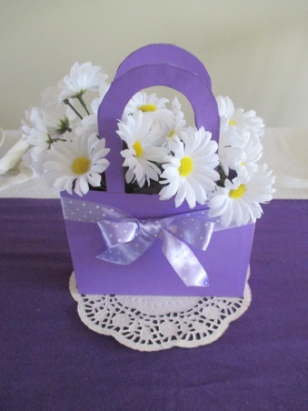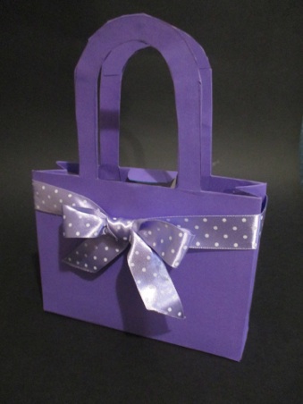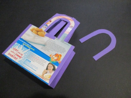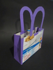 This cute little purse or basket started out as a cardboard cereal box. With just a little bit of colored paper and glue, it is transformed from a piece of trash into a flower basket for a centerpiece, or a purse for your daughter or granddaughter.
