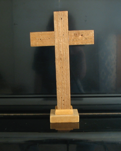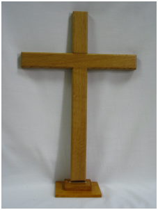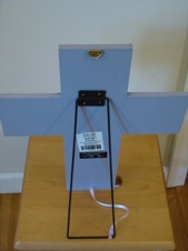 Another way to make a stand is to fasten a metal channel to the back of the cross, then bend a coat hanger or other stiff metal to form the stand that will fold flat for storage. Note that the stand has a ribbon to keep it from going too far back, and falling flat. Another option, instead of a wire stand, would be to fasten a strip of wood on with a hinge.