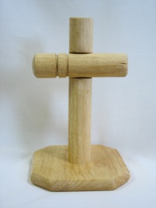 I made this cross out of a paper towel stand from a dollar store ( hundred yen store.) I was trying to figure out a way to make crosses for one dollar (100 yen) or less. It all comes apart (the base unscrews and the cross piece comes off), so it does not take up much storage space. I cut the top third of the dowel off and put a notch in both sides. For a taller cross, buy 2 and cut the cross piece from the second rack--a $2 cross is still pretty inexpensive!