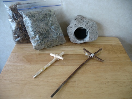 2. CROSSES: Pick up sticks and make crosses. It is probably easiest to fasten on the cross pieces by tying it on with thread or twine. Then poke the crosses into a “hill” in the background. Just be sure to make the vertical sticks quite a bit longer than typical crosses because the bottom 3 inches or so of the stick has to be poked into the dirt to make it stand up..
