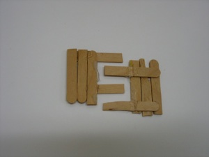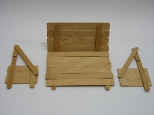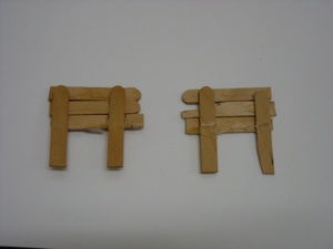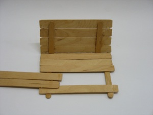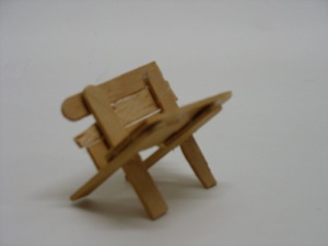 The manger is made out of popsicle sticks, too. I cut 4 legs, and 3 popsicles for each side. The important thing here is to glue on the legs so they don’t bump into each other when you put the two sides together.