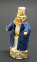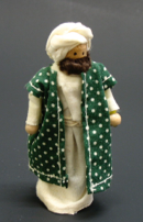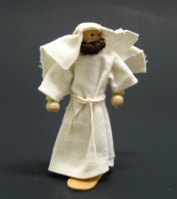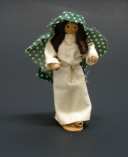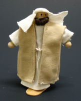 The wise men brought rich gifts, so we assume they were wealthy. I used trim to decorate the hem, added a gold belt, colorful coat, and made a turban from more trim. Joseph was poor as well, so you could make a a head covering like the shepherds, but if you want to make him look a little different, glue a turban to his head--take a strip of white cloth and glue the end to the back of his head. Now twist the cloth and wrap around the head several times. Glue the end in an inconspicuous place.