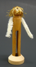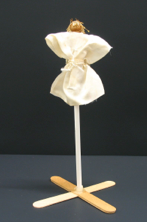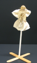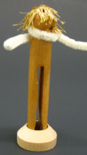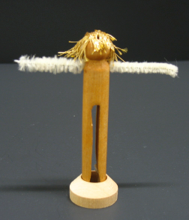 If you want to make the angel in the sky, you will need to make a stand. I used 3 tongue depressors (wider than a popsicle stick, and sold at craft stores. I glued 2 across each other, then cut the third one to glue on under the tongue depressor that was on top, or it would wobble, and not stand up at all. I glued a pencil to the middle of this stand with a glue gun. I out glue between the “legs” of the clothespin, and pushed it on to the pencil. It eventually came apart, which made storage easier, and it still held just pushing the parts together again.