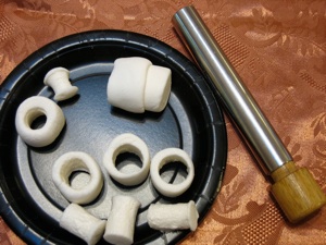To make marshmallow bonnets, heat an apple corer over a burner and use it to melt the middle out of the marshmallows to form the rims of the bonnets. Press the inside “core”out before you remove the corer from the marshmallow, or the middle tends to slide back into the marshmallow as you pull the corer out of the marshmallow, and they are so sticky, there is no way to separate them again. Discard the marshmallow “cores” (or eat them!) Either rub cornstarch onto the insides of the marshmallow cylinders, or leave for several days to dry out--they are too sticky to use as is. Cut each cylinder marshmallow at it’s narrowest point. Then, cut each cylinder again, this time in half lengthwise and lay the two strips over two whole marshmallows. The whole marshmallows form the bonnets, and the strips form the rims of the bonnets. To form the bonnet ties, use kitchen shears to cut around both flat ends of yet another marshmallow. If you don’t have an apple corer, you can use a paring knife heated over a burner, then cut the outer edge of the marshmallows. This all sounds complicated, but it’s not. Once you “core” the marshmallows, it is really quick to assemble the bonnets.