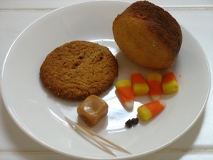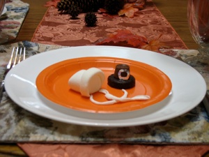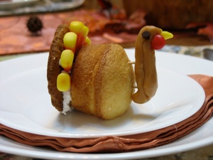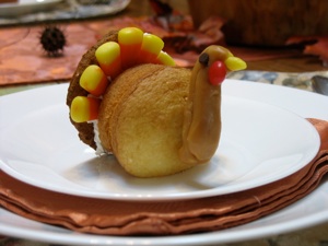 The turkey cupcakes are a little more work, so if you don’t want to go to that much trouble, you can give all the ingredients to the guests, and let each person make his or her own turkey. You will still want to make at least one turkey as a sample, or several samples if there are lots of guests. (If some of them decide to eat the ingredients as is, that’s o.k., too.) If you do make a lot of turkey cupcakes yourself, you will need to make the tail, body, and head and store separately, and then put them together on the day you serve them. Otherwise, if you put them all together and wrap them in plastic, the moisture from the cupcake makes the cookies soft and flop over, and the heads becomes a wet sticky mess. (more true confessions!)