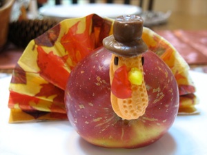 Cut a small slice off the bottom of the apple if it tends to roll. Fold a colorful paper napkin to represent the tail. Make a hat from a Tootsie Roll by squishing it shorter, then pinching out a brim all the way around one end. Poke a toothpick through a marshmallow circus peanut (the head) and into the hat diagonally. Poke two mini chocolate chips into the sides of the head for eyes. For the beak, cut off the yellow end of a Candy Corn, or knead yellow chewy candy such as Star Bursts and form into a beak shape. Use a pointy instrument, such as a chopstick or skewer to poke a hole in the peanut and press the beak into the hole. Cut a gummy candy for the waddle, and press against the peanut near the beak. Poke another toothpick into the peanut, and poke both toothpicks into the apple. The marshmallow circus peanuts will harden if left out in the open, but they don’t taste so great, so your guests aren’t likely to eat them anyway!