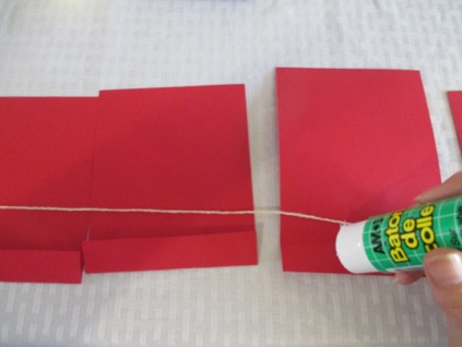 3.Fold the colored paper over the string, and glue the flap down. Be careful to keep the string out of the glue so that you can adjust the spacing once the sign is hung. Test it by pulling the string a bit once it is glued.