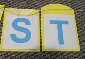 4. If you use mounting putty to hang them, put the mounting putty on the back of the letters on each end, BUT be sure to wrap the end of the string around or through the putty--if you don’t, the string will slide out, and the whole thing will fall to the floor. It is quite hard to get the string back through the seam once the paper is glued, so be careful about this. You could tape the ends of the string to keep this from happening. If the banner is long or large, you may need to put mounting putty on several or even all of the letters.