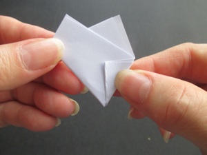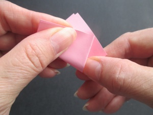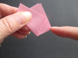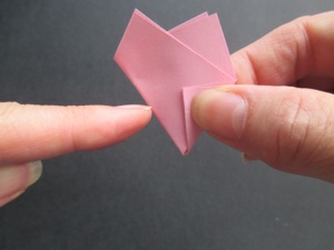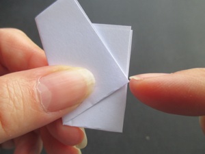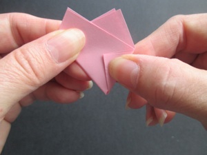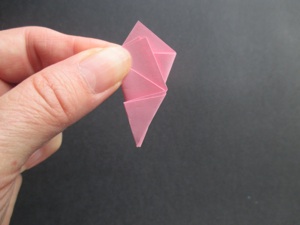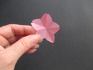 Fold the left side to the back, which leaves the small triangle on the front. All the flowers are folded in this same way.
