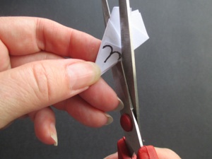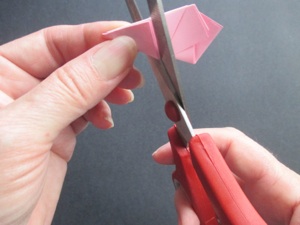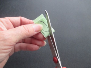Cut along the top edge of the triangle to make the petal shapes. Make the cut rounded, and lower on one side than the other. That is because the high side is the middle of each petal, and the short side becomes both sides of the petal.