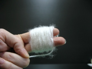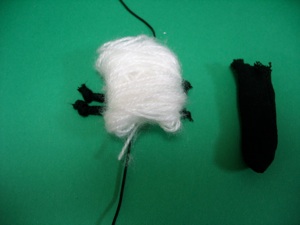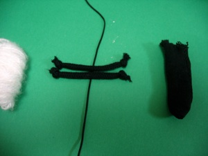 Cut off one finger from a cotton glove (sold in the car accessories section of a 100 yen store) for the head. Cut two lengths of draw string cording (sold in the sewing section of the 100 yen store.) Tie knots in the 4 ends to make the feet.