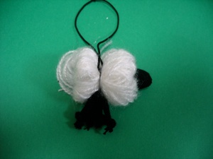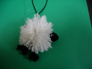 Dangling variation of pom-pom sheep good for hanging from a backpack, or as a Christmas tree ornament
