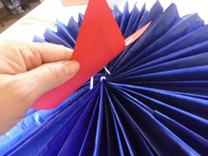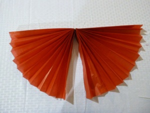 Pull the edges of the folded tissue paper together to make a fan. You may need to adjust the wire in the middle to the right or left, to make sure that where both sides come together, they are the same length. Glue the poster board edges together.