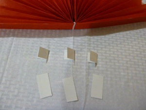 Make poster board tabs to hang the tissue paper fans or discs. Cut short strips out of poster board or card stock (stiff paper.) The size shown here is roughly 1 inch by 2 inches (2x4 cm) Fold these strips in half.