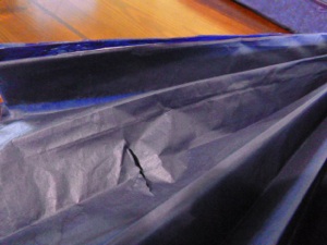 Be sure to rub the glue onto the poster board and not on the tissue paper because the glue will tear the tissue paper when you try to spread the glue on.