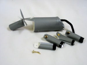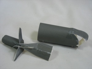 3. Legs: Cut the remaining two tubes as shown in photo above--cut from one open end to the other, then cut each roll in half the other direction. Cut a tab at the top of each leg and poke a hole in it. Roll each leg tight and fasten with tape. Fasten all 4 legs to the body with brads, and make sure they can move back and forth.