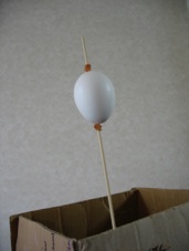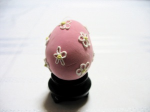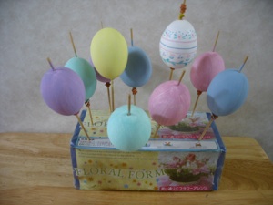 With this method, it is easiest to decorate the eggs if you can spin the egg around on a skewer, so you don’t have to worry about smashing the delicate decorations by holding it with your fingers. The skewer should not go all the way through as in the photo (the photo shows real eggs, so the skewer has to go all the way through.) Oasis, a cardboard box, or a potato all make good stands to poke the skewers into until the decorated eggs can dry--about a week since they are so thick.