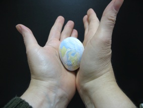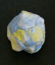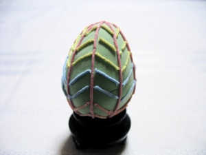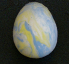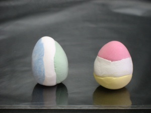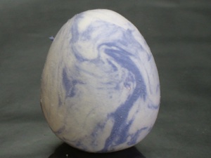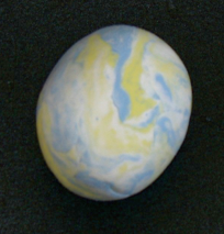 This is a good way to use up left over clay from other craft projects. Gently squeeze together several pieces of left over clay (but don’t squish them together as in the marbled eggs above). Roll them into a ball, then into an egg shape (explained above.) The sections will stick together better if you dampen them slightly before squeezing them together. But don’t add too much water, or the clay will become goopy and hard to work with. If that happens, just wait a minute--the surface dries pretty quickly.