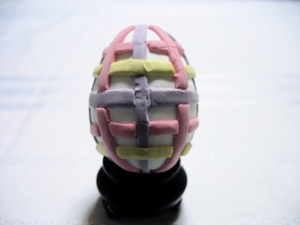 Form egg shape as described above. Rolling the eggs so the stripes are vertical is much easier than if the stripes are horizontal because the horizontal stripes tend to separate.