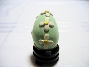 You can also cut out strips of clay with scissors, even scrapbooking scissors that have an interesting design (not shown here, but sold at 100 yen stores.) Be sure not to wet the egg too much, or the pressed on design can melt.
