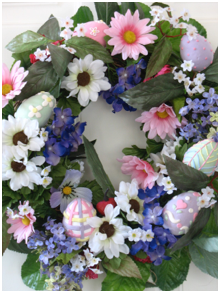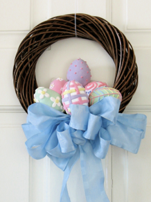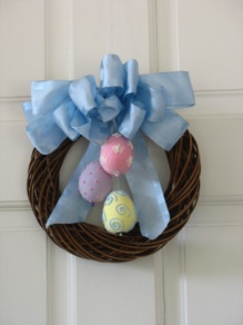 Decorate wreaths with these eggs. Once the clay eggs have dried for a week, you can easily poke florist’s wire through them to fasten them to a wreath (both photos above.) You can poke wires or needles through these eggs as much as 6 months after you have made them. But 2-3 years after they are made, they are rock hard, and that is no longer an option.