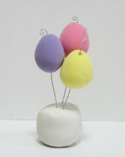 Make an egg “bouquet.” Poke florist’s wire through the eggs, and wind the ends around the tip of a pencil to form tendrils. Poke the other end into a base of heavier air-drying clay and allow to dry for a week. Cut paper “grass” and tie it on with a ribbon. If the clay base leaves a chalky residue, glue a piece of felt to the bottom.